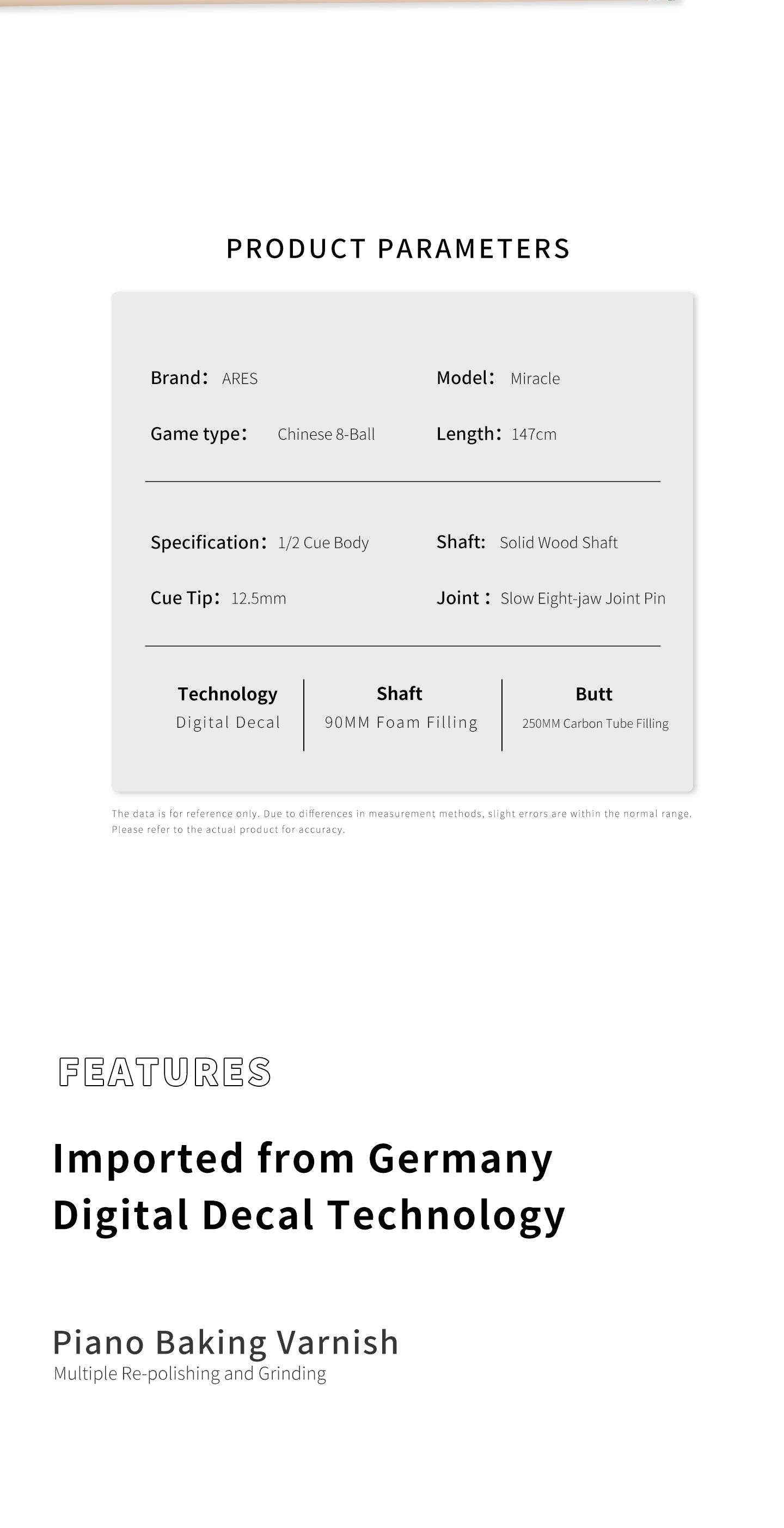 | Cue Tip | Ares 4th Gen "Wild" Tip (Multi-layer Pig Skin). | 【Increased Grip】: Maximizes contact time, aiding in delicate position play; 【Ultra Precise】: Consistent feel from the center to the edge; 【High Resilience & Durable】: No layering, no residue, extended lifespan for prolonged training and competition. |