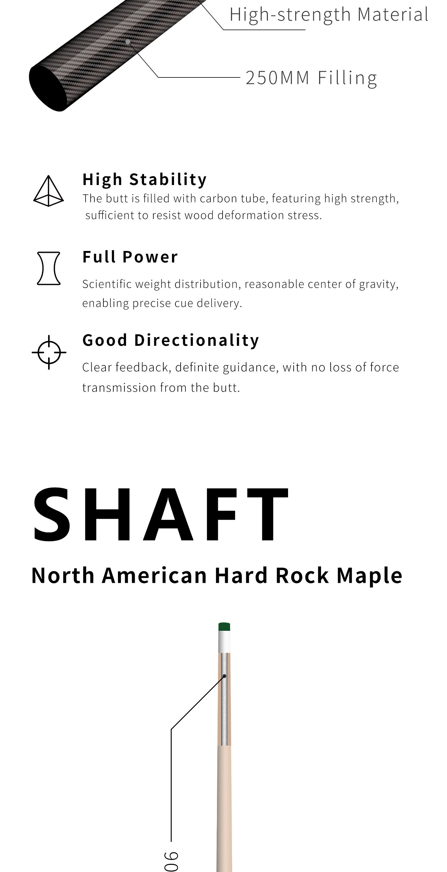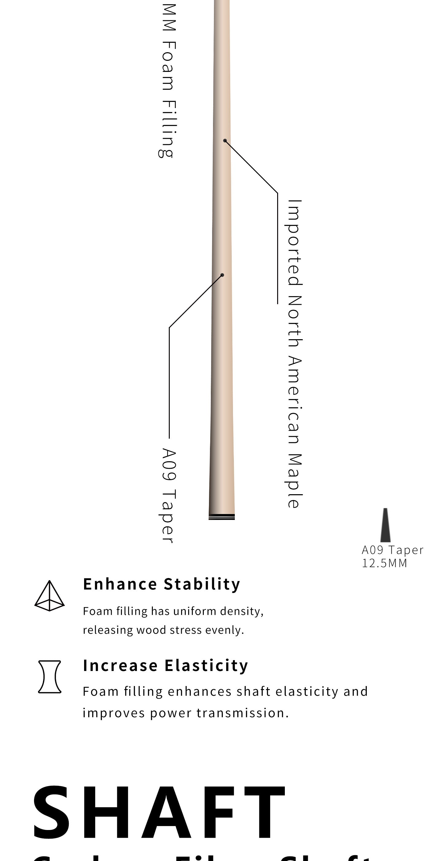 | Solid Wood Shaft | North American Imported A+ Grade Hard Rock Maple; 90MM Foam Filling at the distal end. | Restores Classic Feel, while the foam filling significantly reduces deflection (squirt), giving a low-deflection performance even with a wood shaft. |