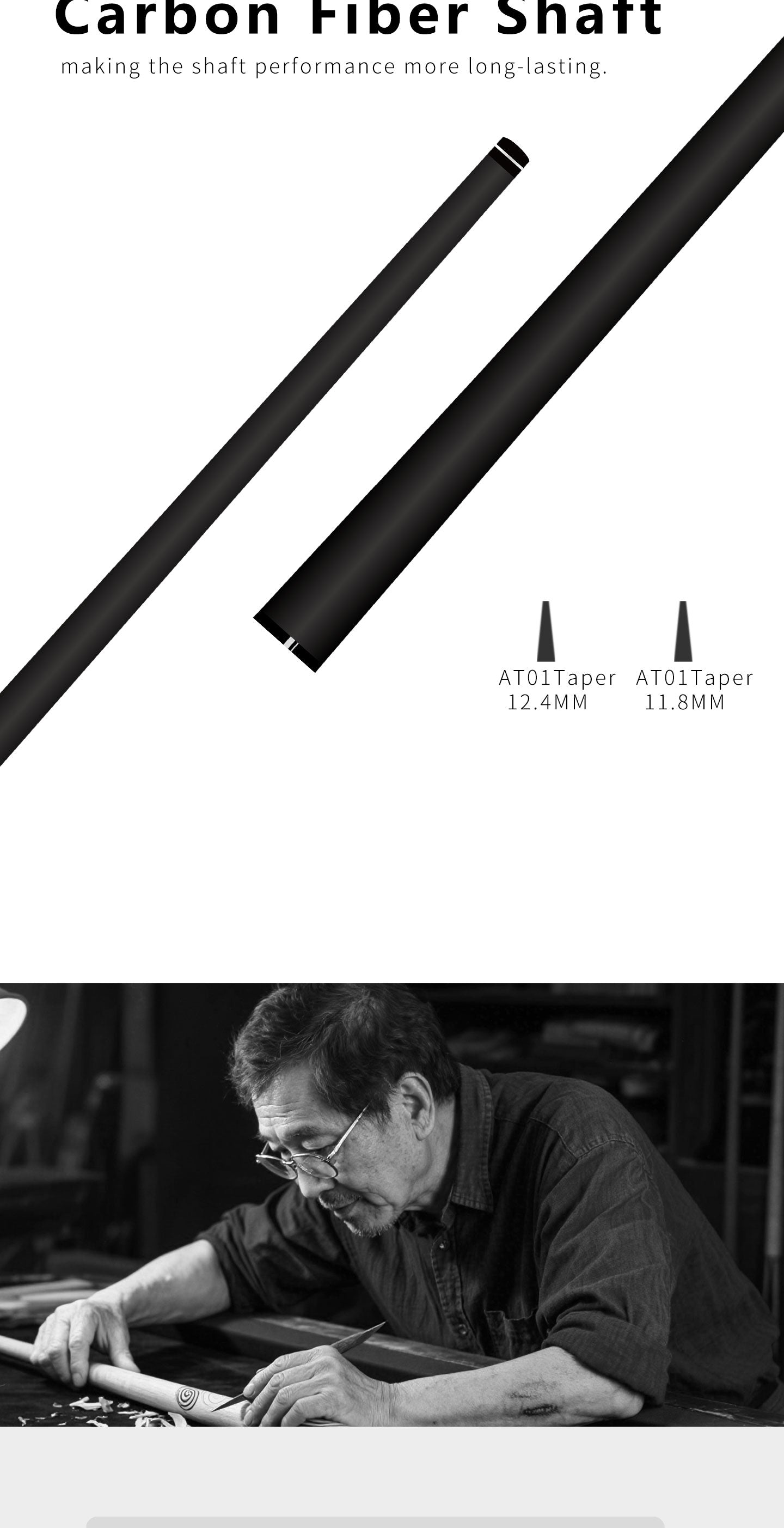 | Taper Options | Black Tech Taper: 12.4mm / 11.8mm; Wood Taper: 11.5mm / 11.8mm / 12.0mm / 12.5mm. | A wide range of tapers meets players' personalized needs for stroke feel and ball speed. |
