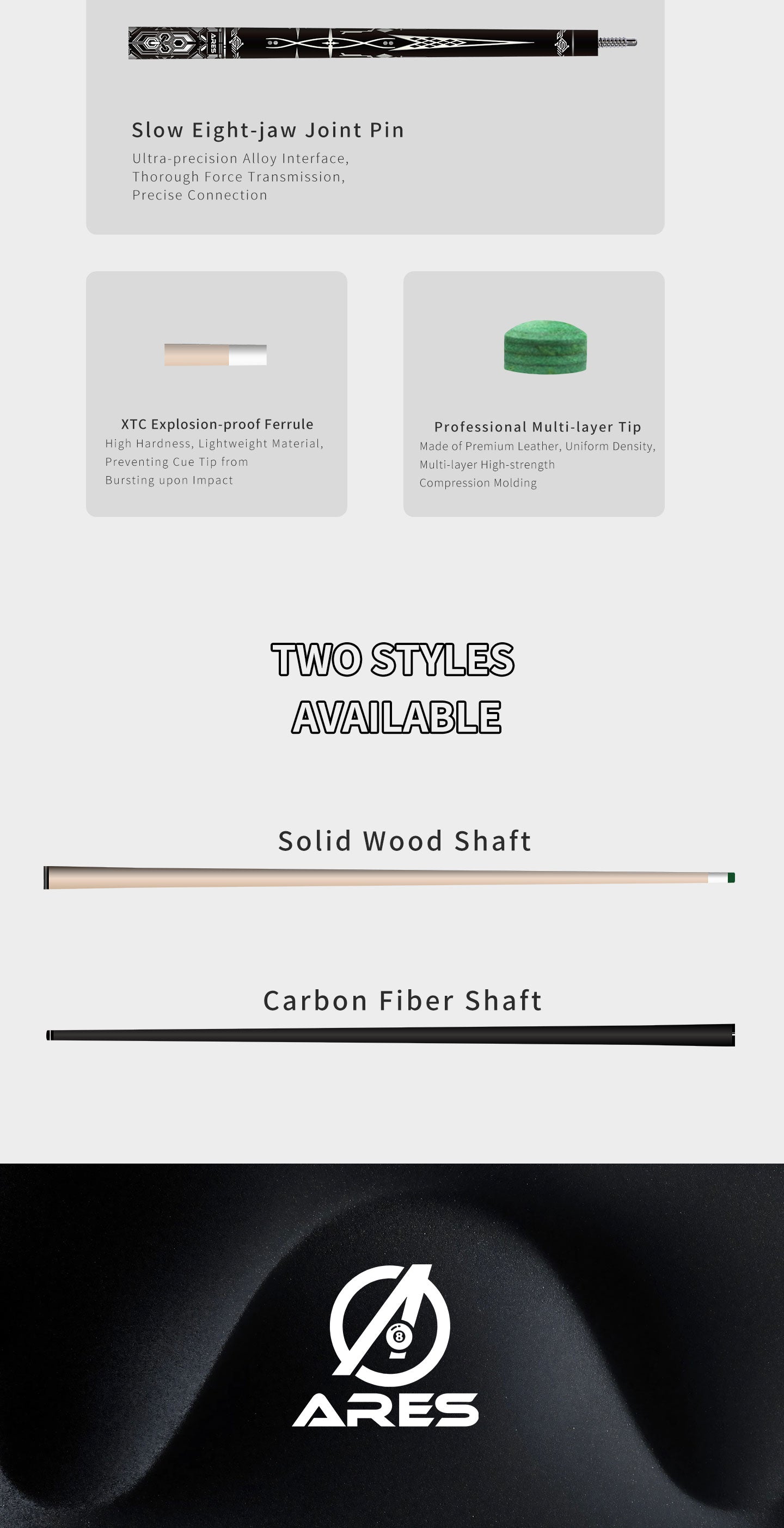 The "Miracle" series is ARES CUE's culmination of precision, stability, and technology. It revolutionarily offers a choice between Solid Wood and Black Tech Carbon Fiber shafts, paired with the new Ares 4th Gen Wild Tip, enabling players to achieve miraculous shifts between aggressive breaking and delicate position play.